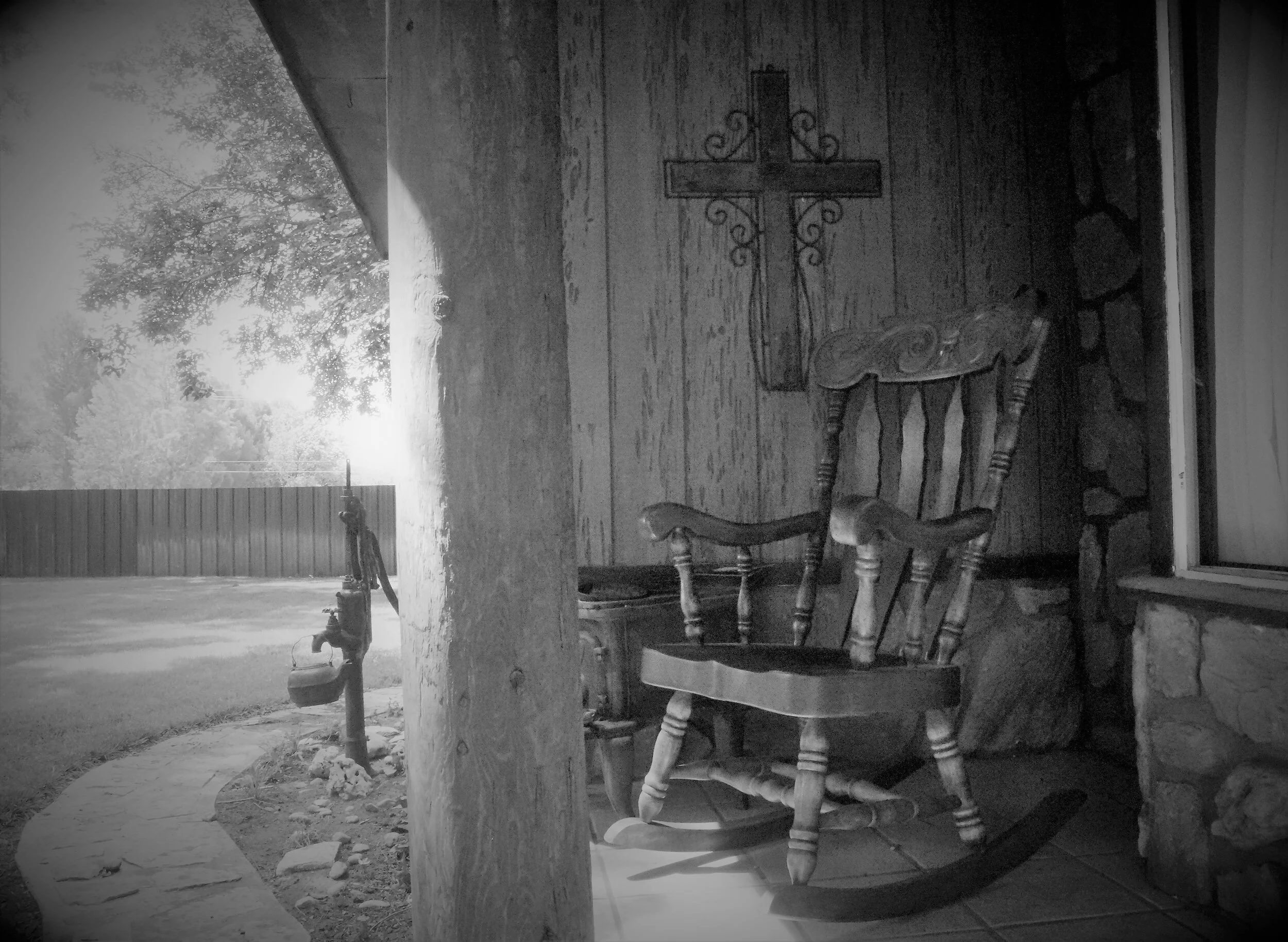 I took this picture shortly after our mother passed in early 2016. It’s the front porch of the house where we grew up in southeast New Mexico. There in the photo, you can see the old rocking chair Mom sat in through many of her years and to the end of her life, with the birds and the morning air, or in the heat of the day after her perpetual tending of the flowers, shrubs, and trees. It is a special place and a special chair.